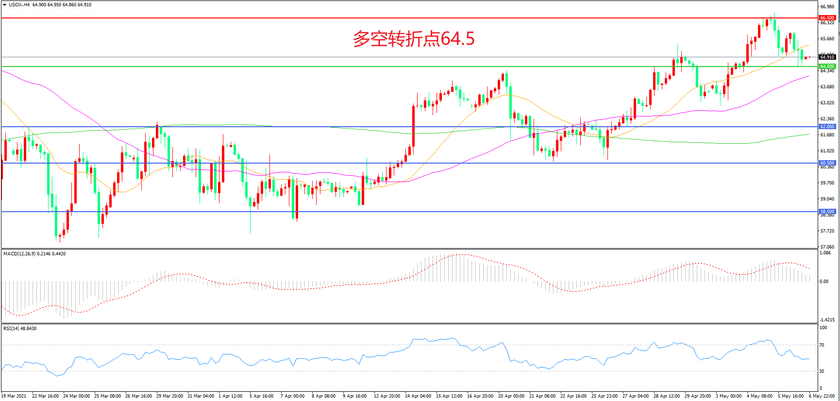 周四(5月6日),市场仍旧关注全球疫情发酵,对于未来需求的恢复速度难以确认,美国WTI原油整体波幅不大,窄幅震荡后收报65.20美元/桶。根据最新的数据显示,印度的疫情单日新增突破40万,当前的时间点上,在印度疫情仍在继续发酵的同时,多头在盘面上似乎表现出了信心不足的迹象。