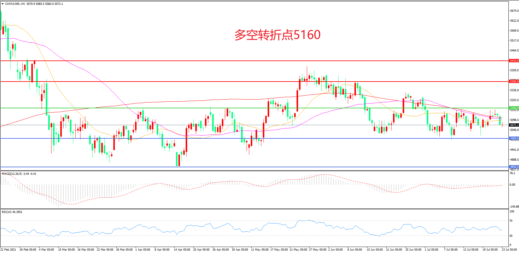 4小时图看,沪深300延续区间震荡形态,5160成为上方阻力,5000点成为下方支撑,均线系统逐渐走平,日内震荡上行概率较大。