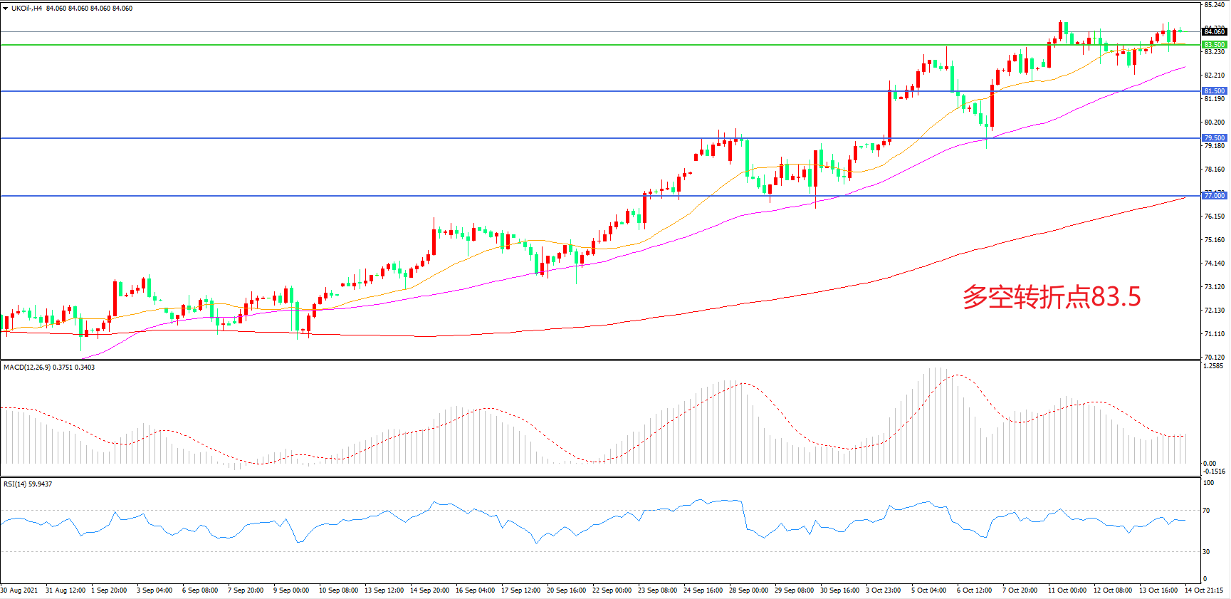 4小时图看,油价整体呈现高位震荡形态,均线系统呈多头排列,MACD红柱缩短,RSI指标走平,日内延续震荡概率较大。