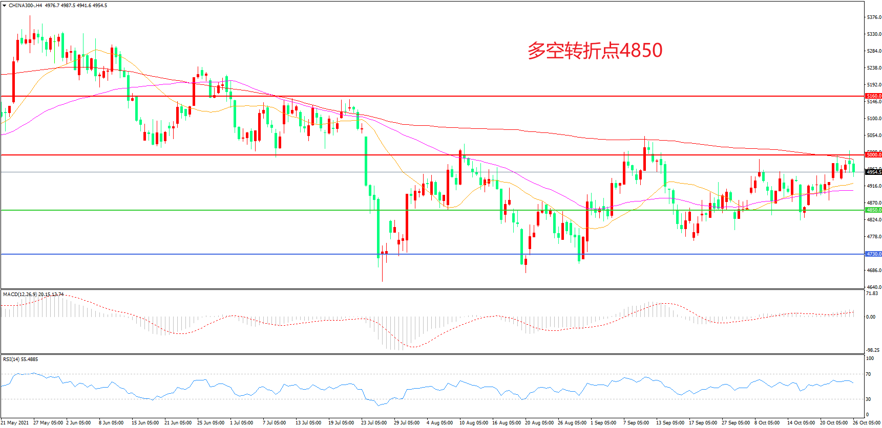4小时图看,沪深300触碰200周期均线后小幅回落,区间震荡迹象明显 ,短期均线成为下方支撑,MACD红柱增加,RSI指标走平,日内延续震荡概率较大。
