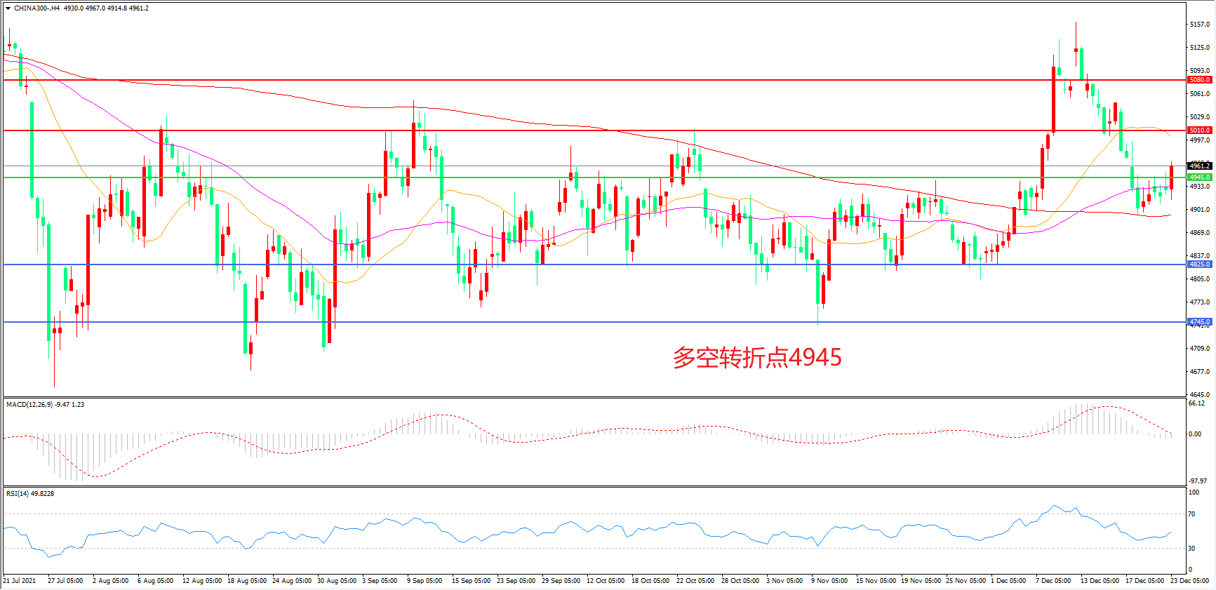 4小时图看,沪深300回踩55周期均线后震荡走高,短线走势回暖,但形态上看空头趋势未改,4945成为多空分水岭, MACD绿柱缩短,RSI指标走平,日内延续震荡概率较大。