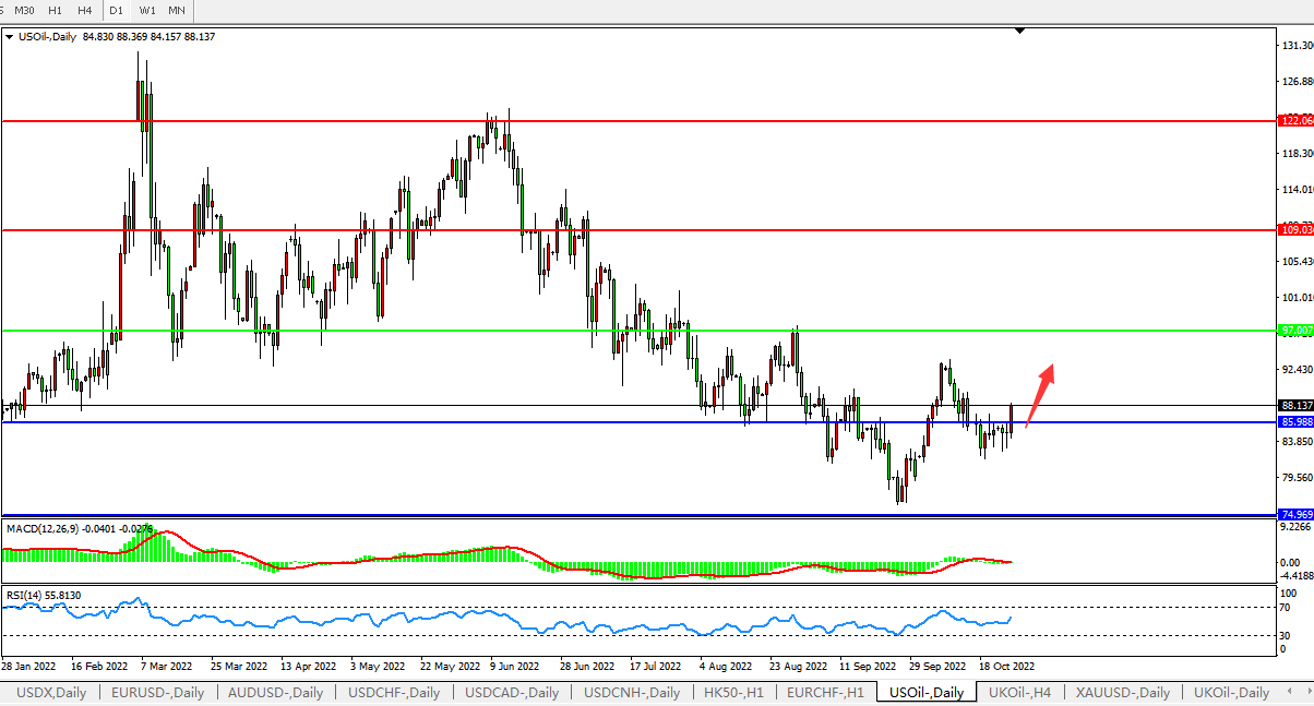 日线图看:油价低位盘整后开始上行, MACD量能柱0轴附近徘徊,RSI指标小幅上行,短期油价延续反弹上攻概率较大。