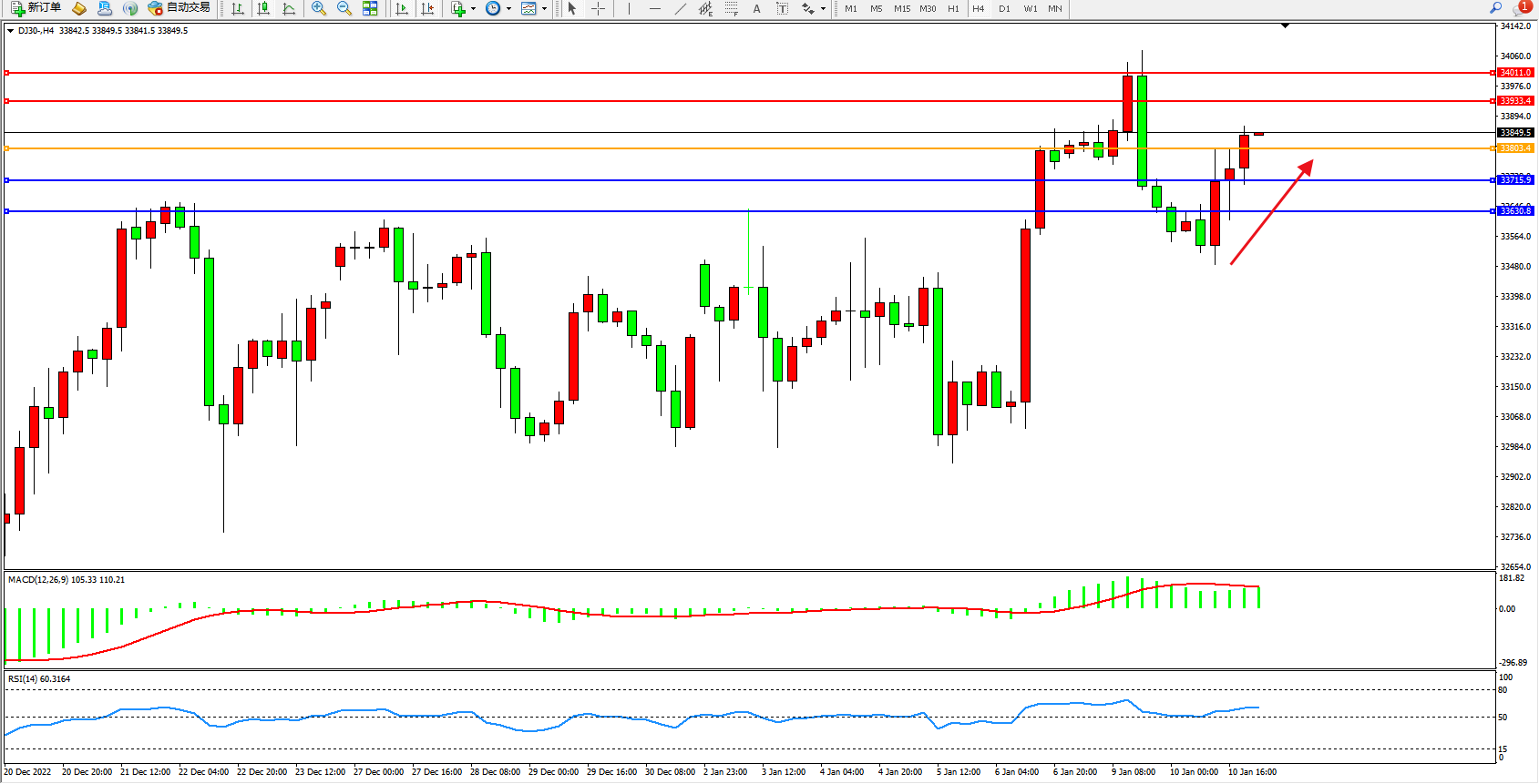 4小时图看:高位多头动力宽幅震荡上移,市场看涨情绪涌现,MACD指标处于多头区域整理,RSI指标处于多头区域弱势整理;