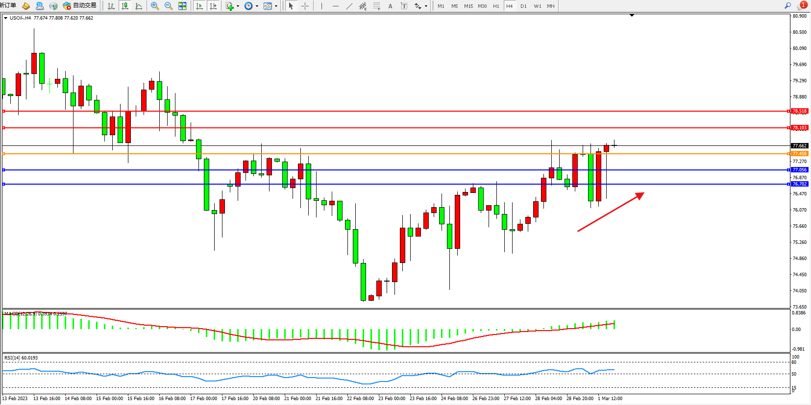 原油维持77.671附近震荡,美国至2月24日当周EIA原油库存 116.6万桶,预期45.7万桶,前值764.7万桶。俄克拉荷马州库欣原油库存 30.7万桶,前值70万桶。