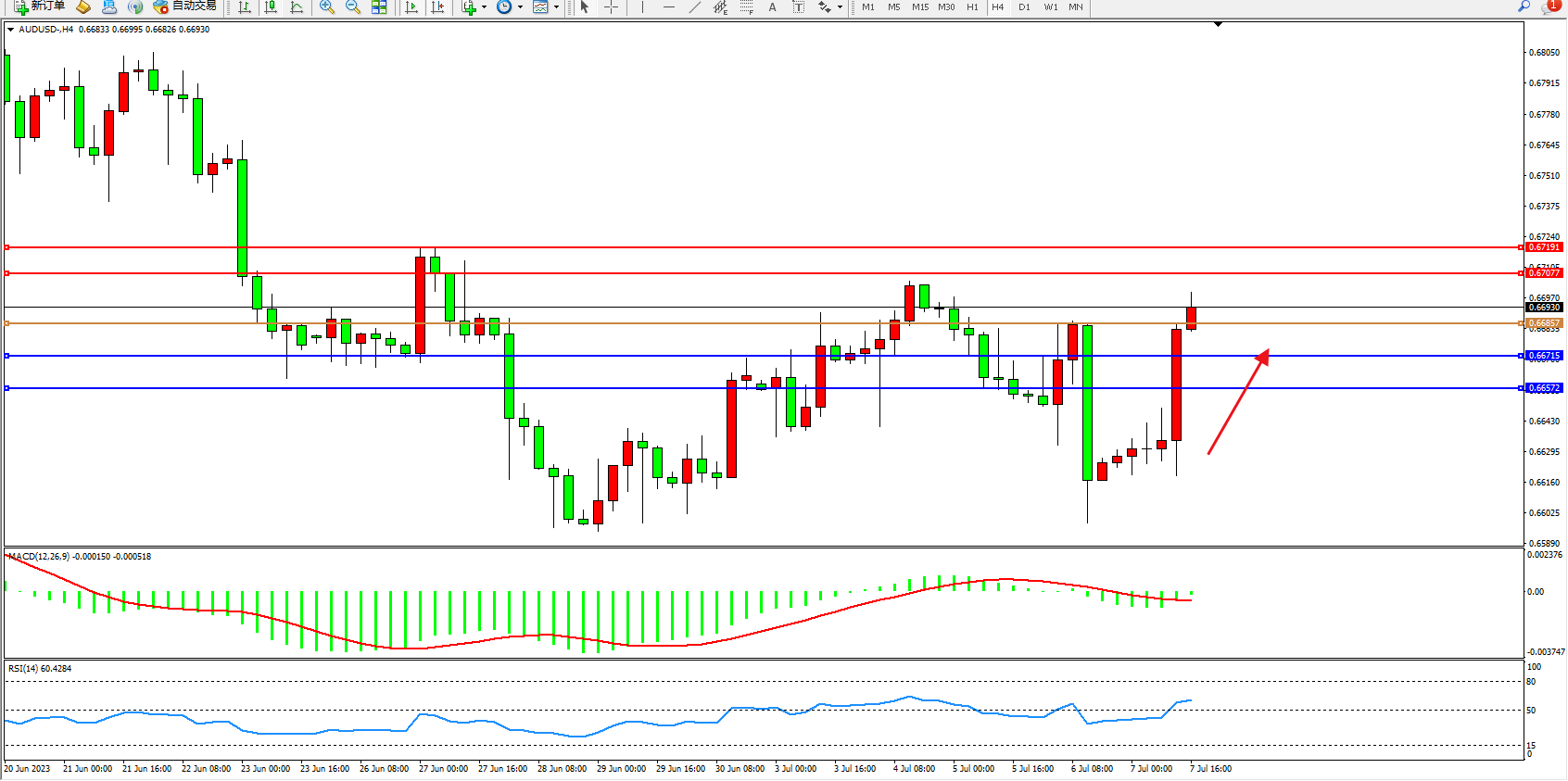 交易策略:0.66857上方看涨,目标0.67077  0.67191